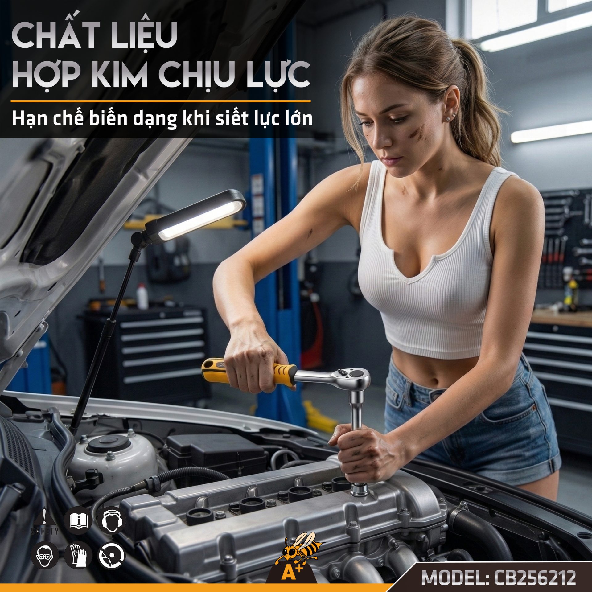 Thiết kế tay cầm cong giúp tăng lực đòn bẩy và kiểm soát tốt hơn khi thao tác, đặc biệt hiệu quả trong môi trường làm việc chuyên nghiệp như gara, xưởng cơ khí và công trình.