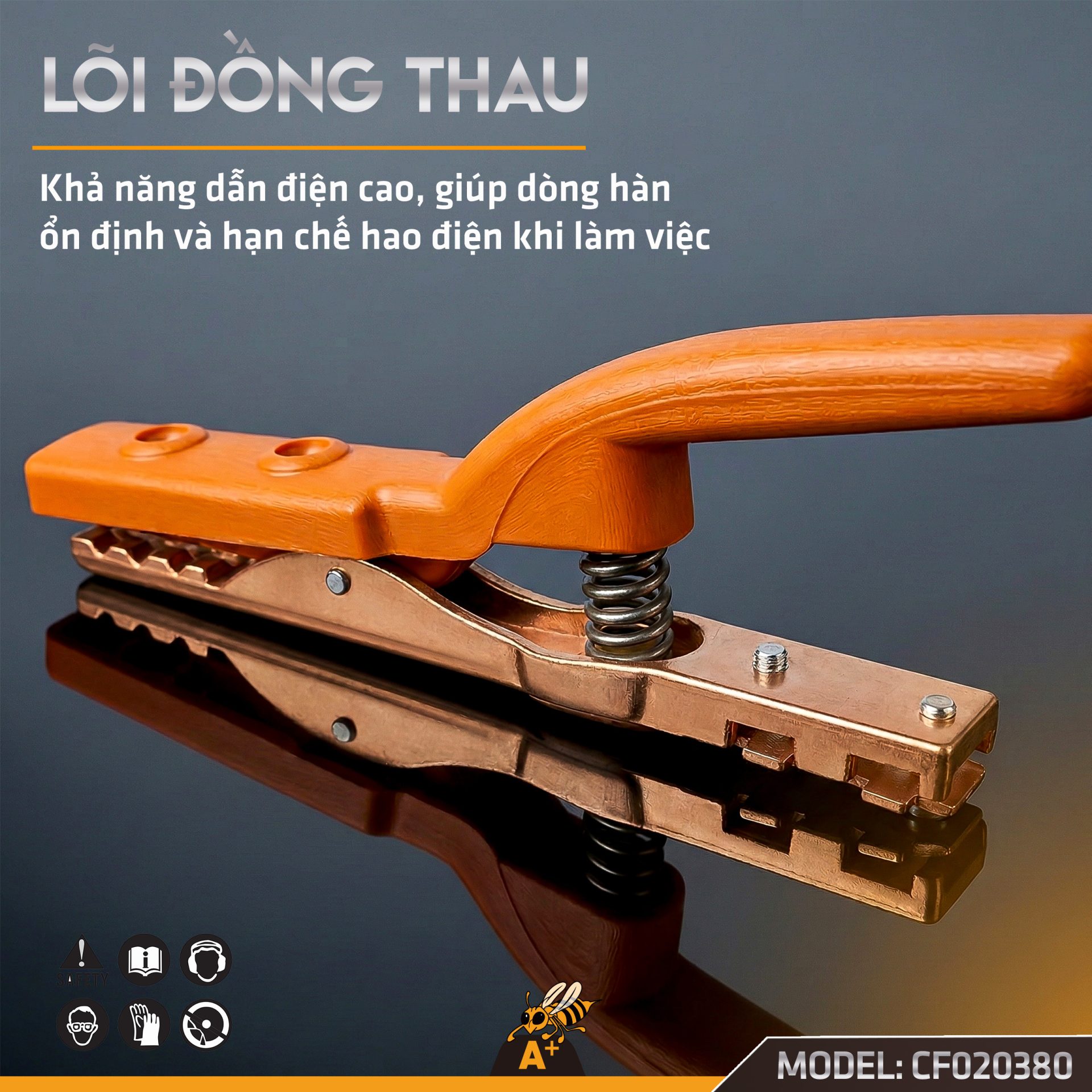 Chất liệu kẹp que hàn: Đồng thau nguyên chất, tay cầm cách điện an toàn, chống chảy. Hàm trên hàm dưới được cấu tạo liền mạch nên tạo độ chắc chắn khi kẹp.