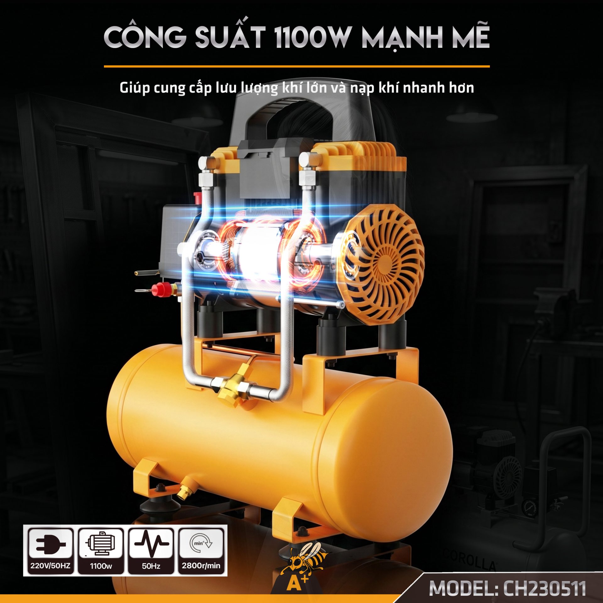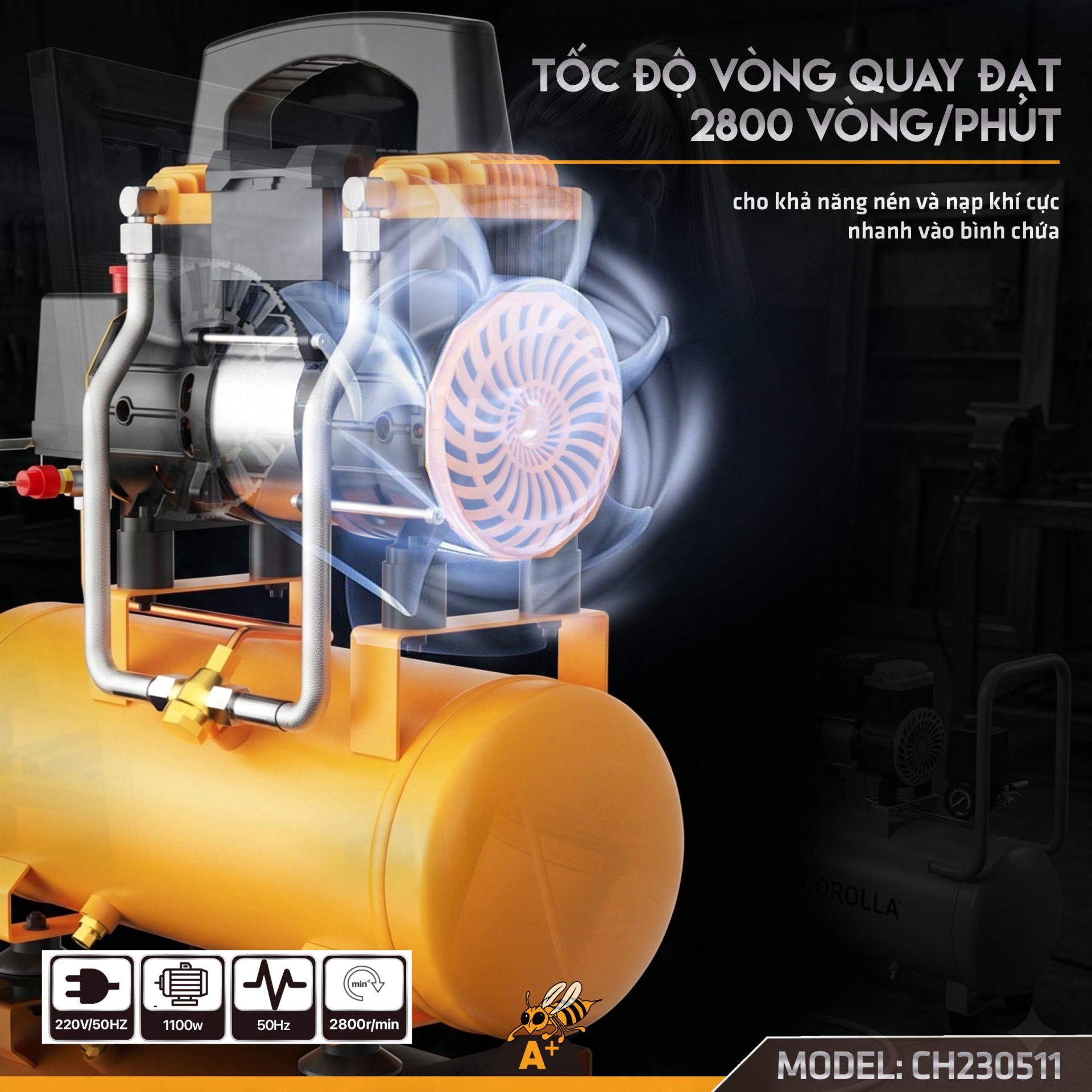 • Nạp hơi nhanh chóng: Công suất 1100W và tốc độ 2800 vòng/phút giúp đầy bình chỉ trong vài chục giây.